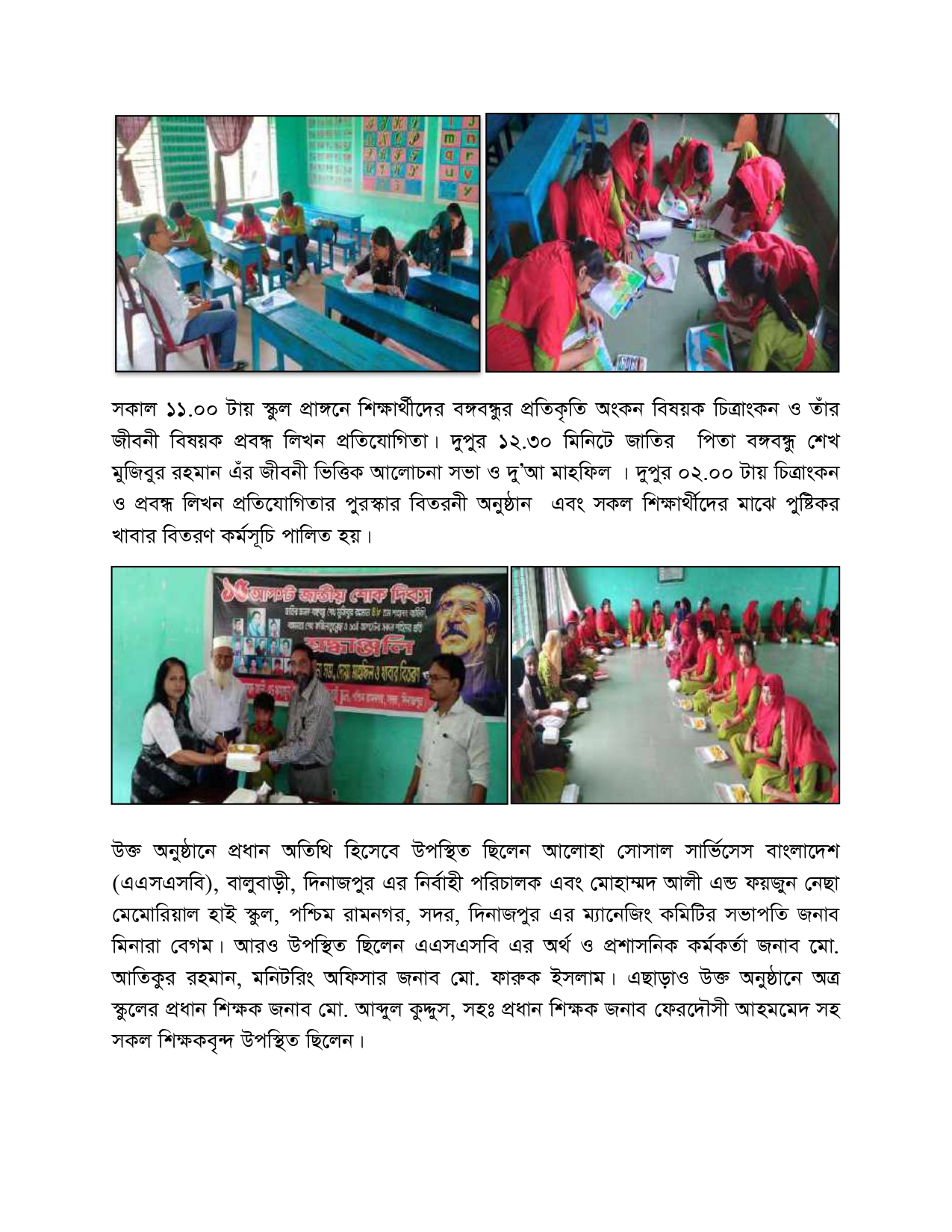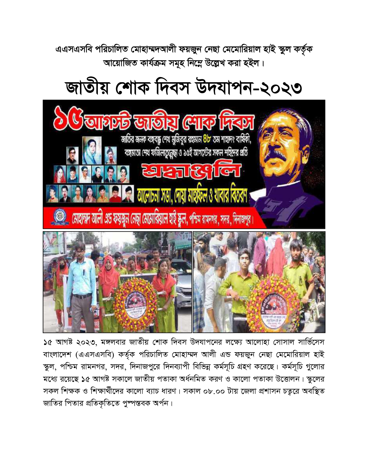 আলোহা সোসাল সার্ভিসেস বাংলাদেশ (এএসএসবি) , বালুবাড়ি দিনাজপুর এর কার্যনির্বাহী সদস্য জনাব শহীদুল্লাহ গত ০১ মে রোজ বুধবার সকাল ৯ ঘটিকায় হৃদরোগে আক্রান্ত হয়ে নিজ বাসভবনে ইন্তেকাল করেন (ইন্নালিল্লাহি ওয়া ইন্না ইলাইহি রাজিউন)| এএসএসবি পক্ষে আমরা সমবেদনা।