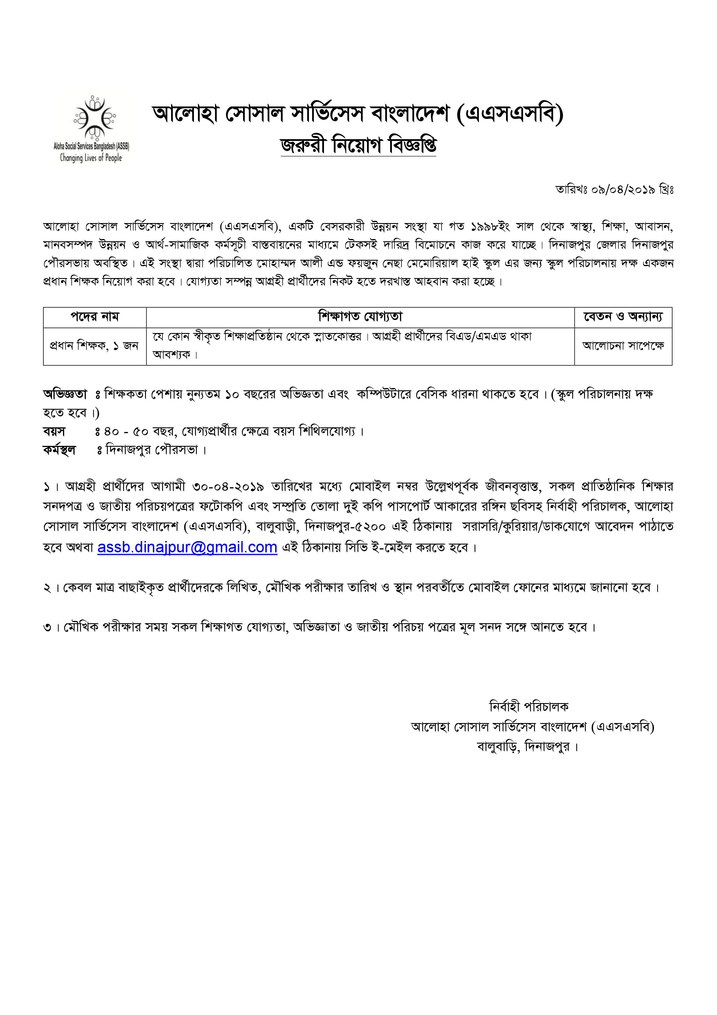 আলোহা সোসাল সার্ভিসেস বাংলাদেশ (এএসএসবি) , বালুবাড়ি দিনাজপুর এর কার্যনির্বাহী সদস্য জনাব শহীদুল্লাহ গত ০১ মে রোজ বুধবার সকাল ৯ ঘটিকায় হৃদরোগে আক্রান্ত হয়ে নিজ বাসভবনে ইন্তেকাল করেন (ইন্নালিল্লাহি ওয়া ইন্না ইলাইহি রাজিউন)| এএসএসবি পক্ষে আমরা সমবেদনা।